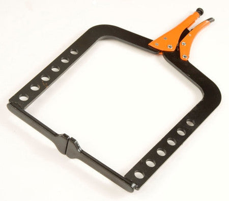 A one hand operational clamp for body repair work, metal fabrication and general welding jobs. Large capacity jaw profile allow for clamping around large sections, e.g. rocker panels in auto body, and probide good visibility for welding.