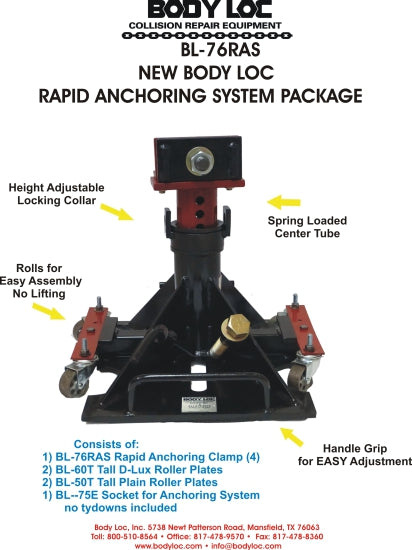 NEW Body Loc Rapid Anchoring System package is FAST and Easy Way to quickly raise a vehicle and anchor it. Use a Service Jack to lift the vehicle into the Roller Plates and then secure the vehicle with the Rapid Anchoring System.