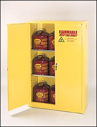 Eagle Flammable Liquid Safety Cabinet Model 1947 is a Standard 45 gallon manual close safety cabinet with 2 shelves. Constructed of 18-gauge steel, sides, top, bottom, and doors are double-walled with a 1 2/2" air space between walls. Both vents, with 2" threaded fittings, have fire baffle and cap. Cabinets come in yellow high gloss powder finish with warning lables, plus grounding attachment, 3-point key lock, and 2" raised, leakproof door sill. Each shelf is adjustable and can support 350 pounds. Cabinets meet NFPA Code 30 and OSHA requirements and are FM approved.
