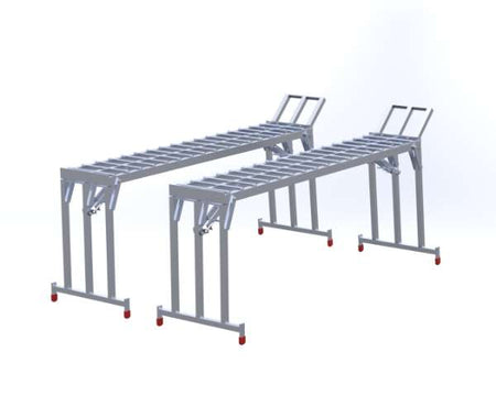 Raised platform for service or display of small power equipment. Locking legs fold under for storage. Bolted stops to prevent roll off. Ramps sold separately.