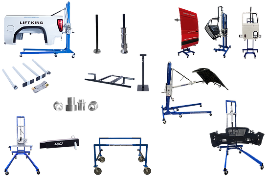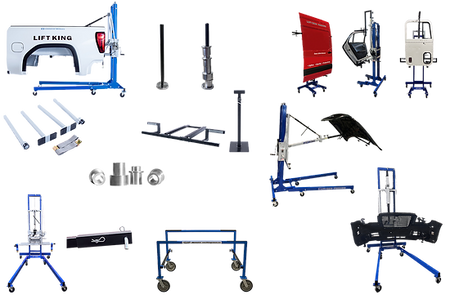 The Lift King Light Duty Works Package comes with everything needed of one technician of any size to remove or install OEM pickup boxes of all sizes, including 8' dually boxes. It also comes with other attachments, allowing a a technician to remove bumpers, hitches, automotive hoods, & automotive, sprinter, & semi cab doors.