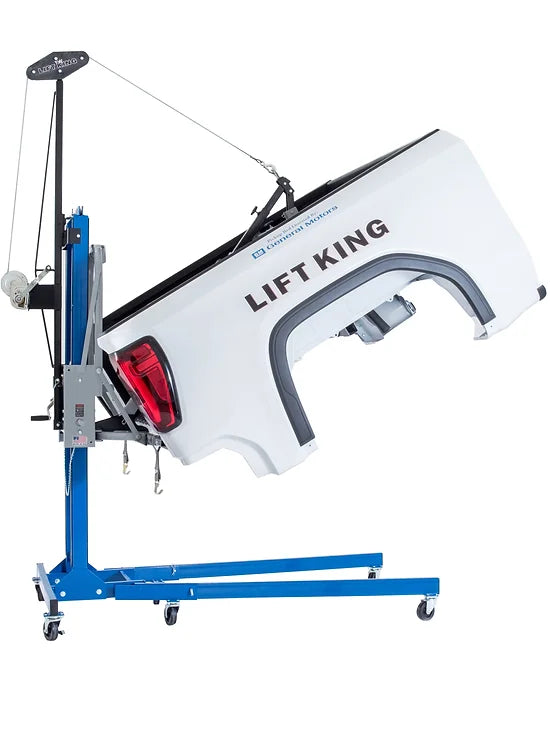 The Lift King Tilt Boom Attachment is designed to tilt a pickup box in an upward position for under box repairs, sandblasting, restoration, painting, or rust proofing. The Tilt Boom Attachment connects to the Main Component in a matter of seconds by setting it in the designated position with the addition of one pin.