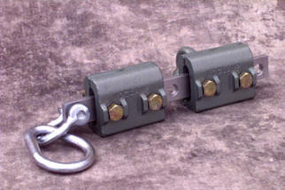 Two pair Frame Rack Dyna-Mo jaws with 12" draw bar, one side pull bracket, shackle and oval loop. Raised "ears" to hold bolt in place while tightening.