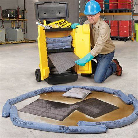 - Easily work to clean any small or moderate sized spill since the spill caddy's spacious interior holds 20 gallons-worth of absorbents and spill-responce items, and the lockable front-loading doors open wide for convenient access