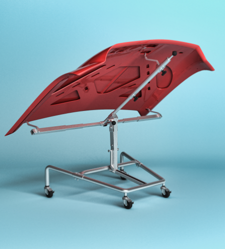 Rolling work stand for holding hinge mounted automotive body panesl. Fits hoods, doors, deck lids, lift gates and pickup tailgates. Designed to hold, transport and effortlessly rotate body panels to speed up repair and painting in a professional body shop setting. No additional accessories required.